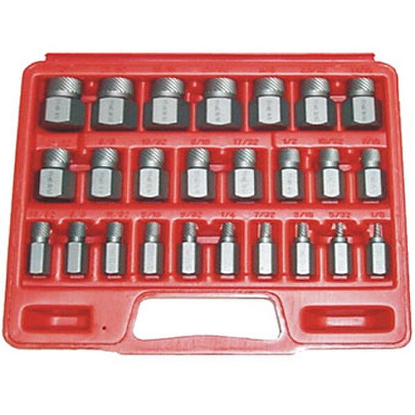 Extractor Set $224.00 Quantity discounts available QuantityPrice SKU: 8988 This item is IN STOCK Quantity -+ Add to Cart Details 25Pc. Wedge-Proof Screw Extractor SetDesigned to remove broken fasteners without breaking or jamming. Will turn broken fasteners out while permiti... Details Back Details25Pc. Wedge-Proof Screw Extractor SetDesigned to remove broken fasteners without breaking or jamming. Will turn broken fasteners out while permiting the highest torque without expansion.Made from C4150 alloy steel.Sizes: 3-22mm in 0.8mm incrementsAll Extractor Lengths: 35mm