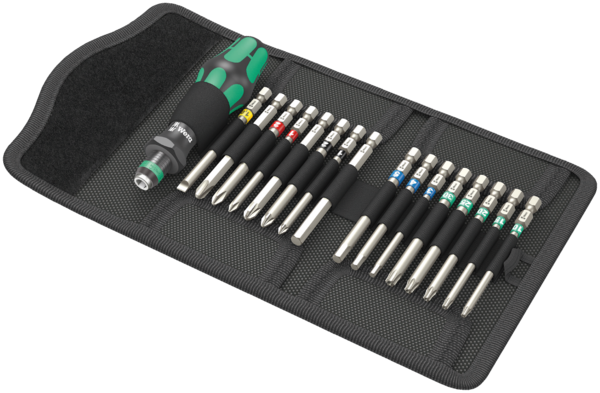 Folding pouch with 89 mm long bits. Including 816 R Kraftform bitholding screwdriver with Rapidaptor quick-release chuck and multi-component Kraftform handle for fatigue-free working. Hard handle zones for high working speeds, while soft handle zones guarantee a high torque transfer. Profile and size of the bits are easily recognized thanks to the Wera Take it easy tool finder with its colour codes and labels. Suitable for manual and machine operated couplings. 17-piece set.