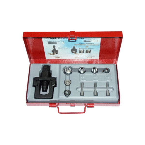 Set contains all the tooling required for cutting and disassembly of press fitted connecting links. Also for rivetting of the connecting pins and press fitting of the connecting pin plate. Full instructions are included.