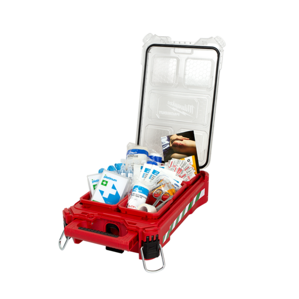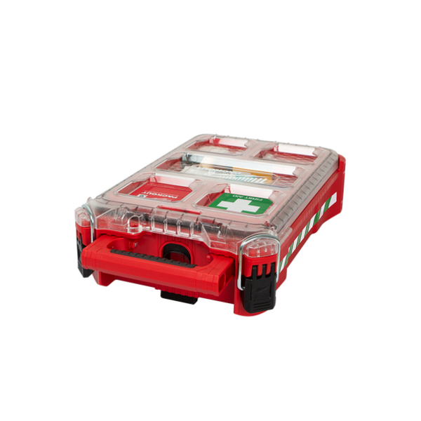 In conjunction with St. John, Milwaukee has designed a workplace PACKOUT™ First Aid Kit. Equipped with First Aid Kit essentials, this handy case will help keep all your items organised, protected and accessible, in the car and on the jobsite. The PACKOUT™ modular storage system will allow you to safely transport and customise your First Aid needs from the car to the jobsite.