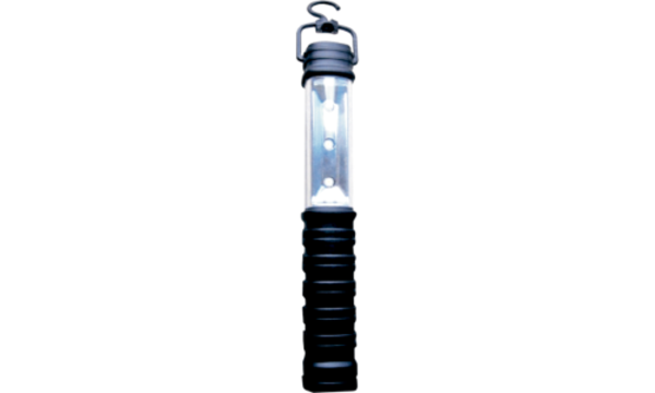Forth LED fitted on end. Its built shop-tough with a non slip grip, shock-proof housing, a replaceable polycarbonate lens shield and replaceable 360° swivel hook and a replaceable and rechargeable super strength NiMH battery.